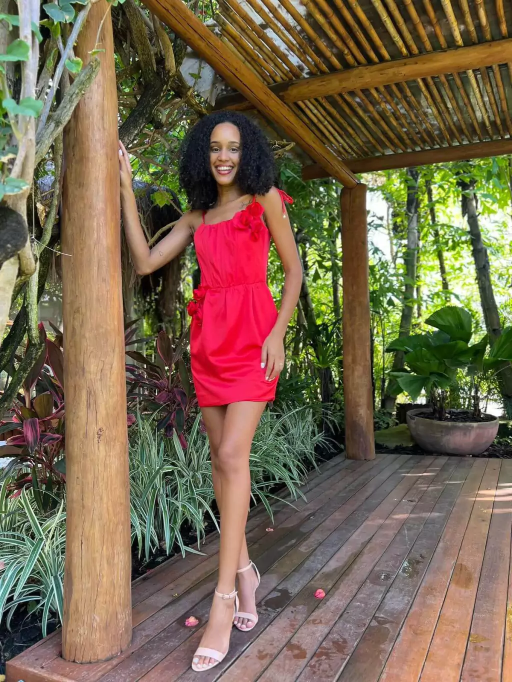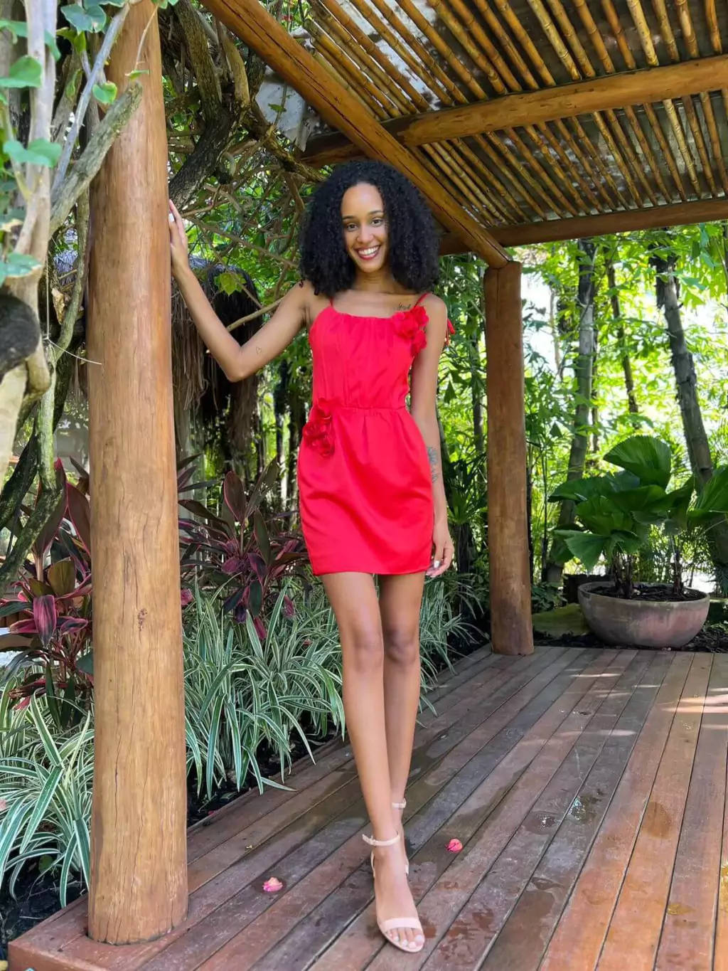 A combinação do vermelho intenso, das alças delicadas, da estrutura de corpete e das flores bordadas resulta em uma estética deslumbrante, perfeita para ocasiões especiais. O comprimento curto do vestido o torna adequado para eventos mais descontraídos e festivos, mantendo ao mesmo tempo uma aura de elegância. Em resumo, este vestido é uma escolha única e memorável, combinando elementos sofisticados para criar uma peça verdadeiramente especial.
