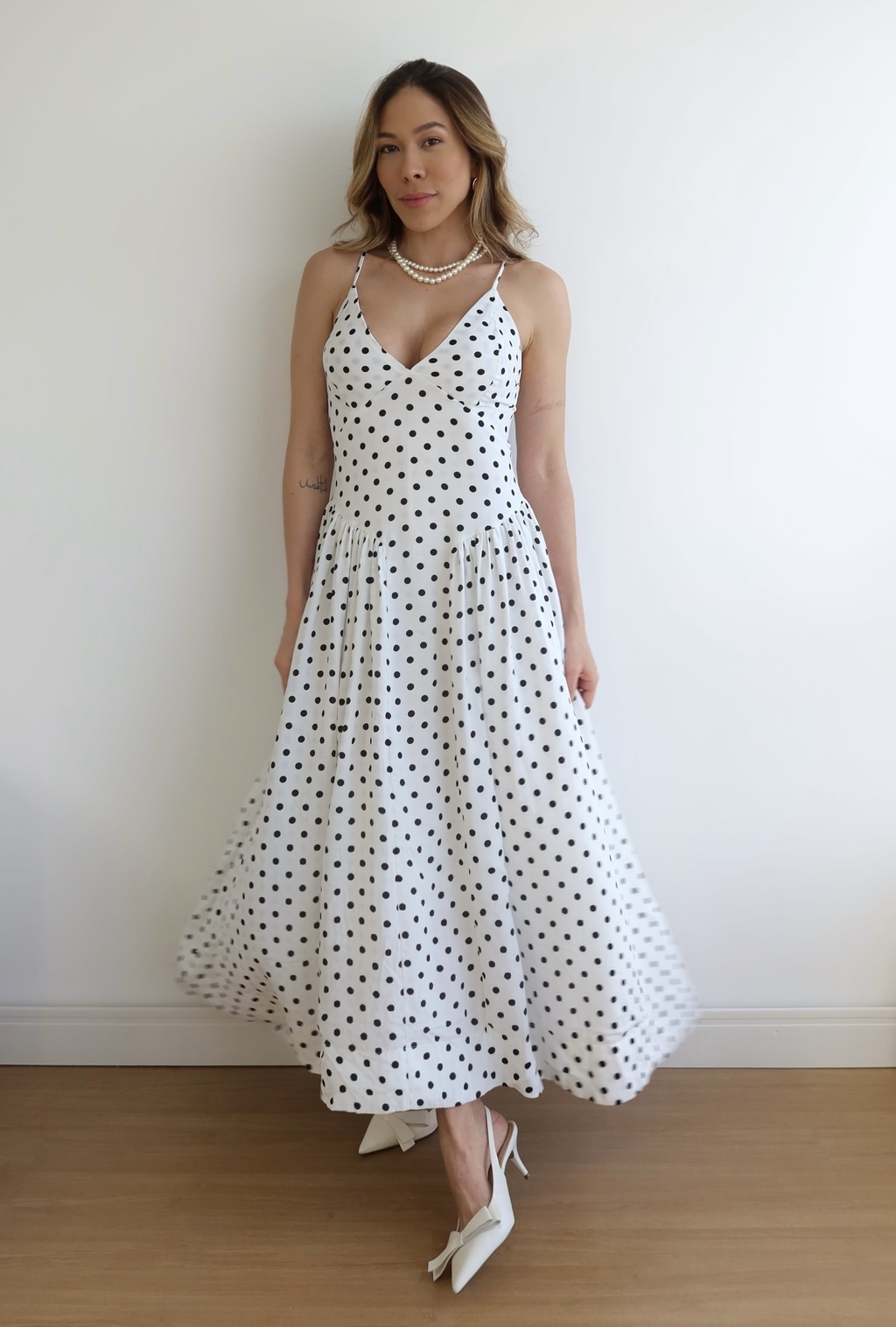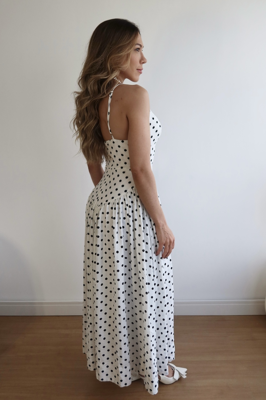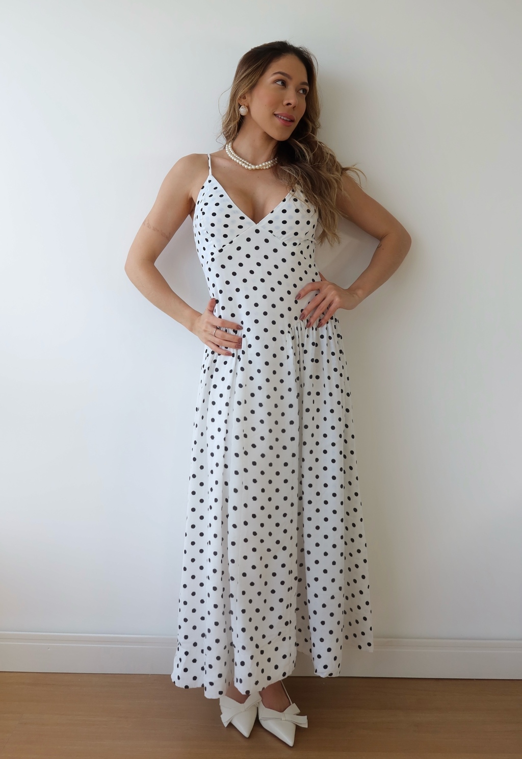 Suas alças finas e reguláveis garantem ajuste personalizado, enquanto o decote em V valoriza o colo com sutileza. A modelagem bem acinturada realça a silhueta e a saia fluida confere movimento leve, resultando em um visual delicado e marcante.